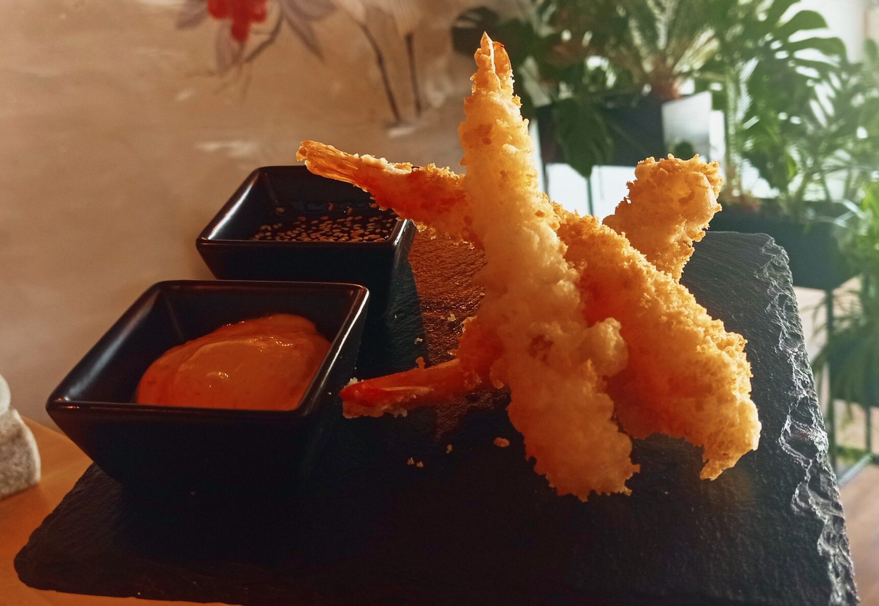Chrupiące krewetki w panierce podawane z sosem spicy mayo oraz teriyaki