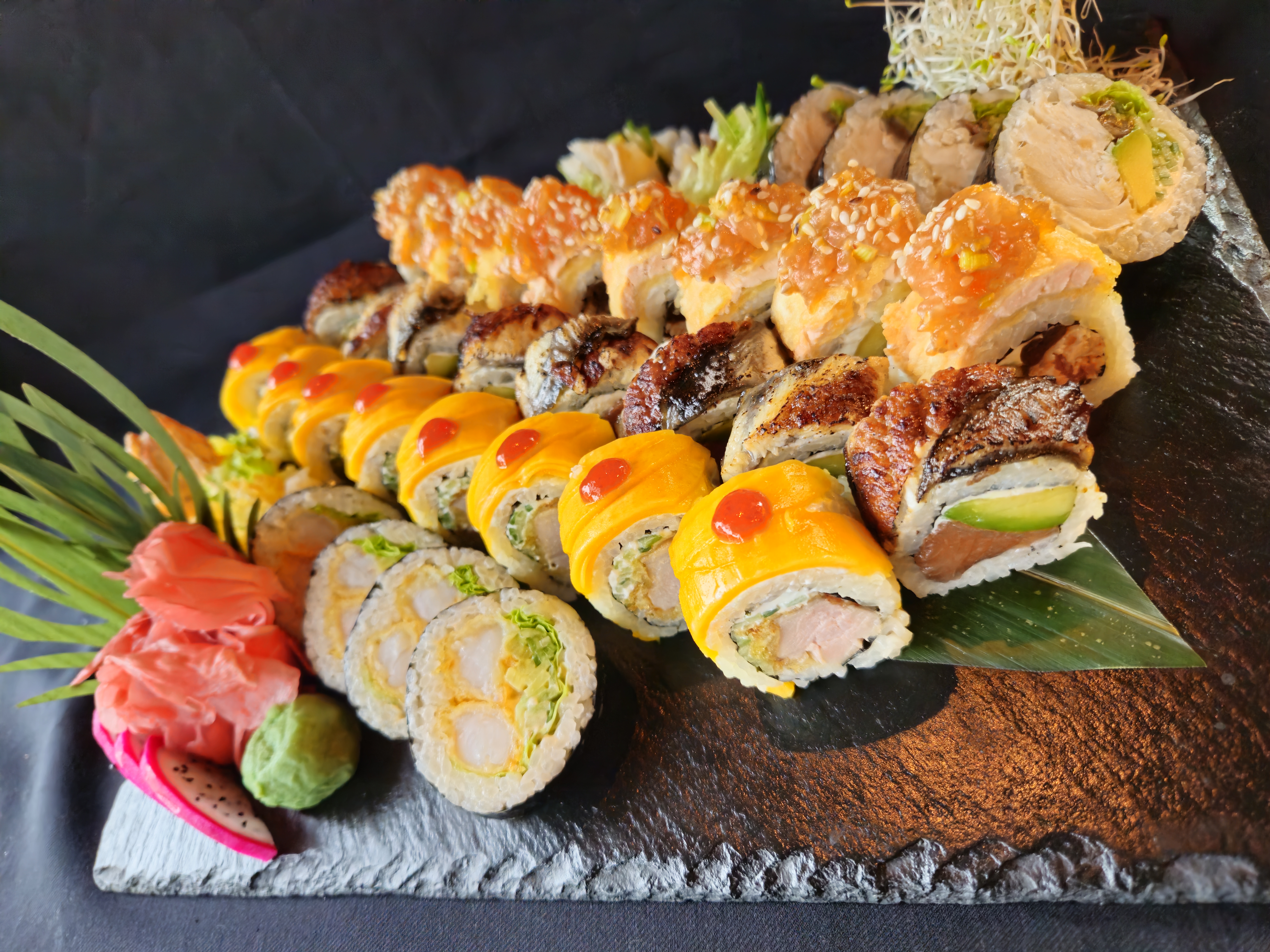 - California z krewetką w tempurze obłożona łososiem opalanym z dressingiem jalapeno 8 szt.